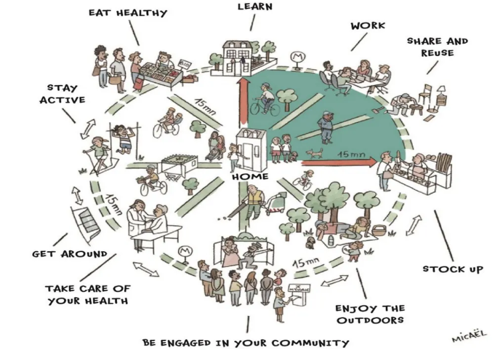 The 15-minute city is a concept in which residents can access work, education, healthcare, leisure, and shopping within a 15-minute walk or cycle from their home.