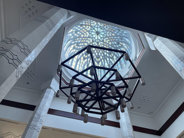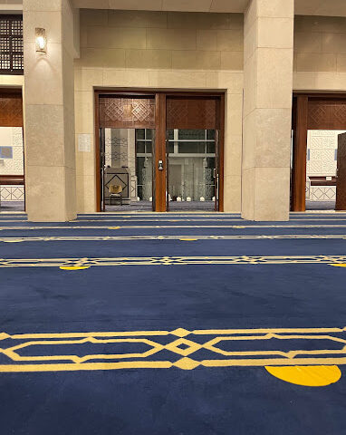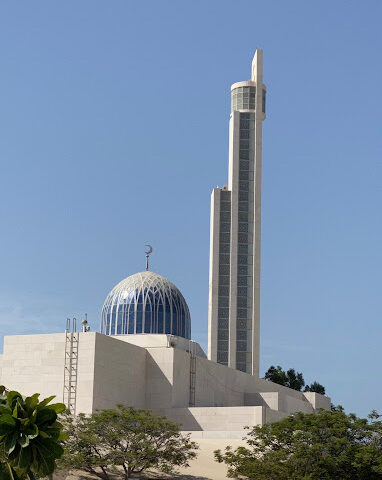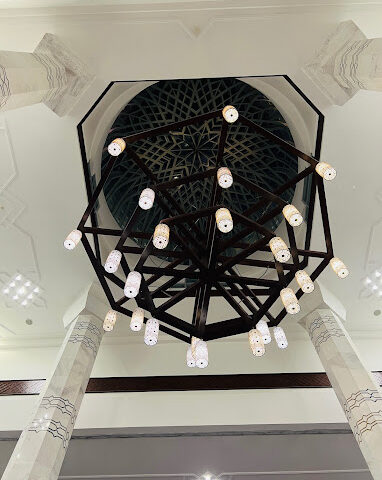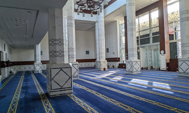Adorned with white and blue glass windows, the mosque gleams in the sunlight, creating a mesmerizing interplay of light and shadow. These elegant windows also allow natural light to filter through to the Alquibla, the direction Muslims face while praying towards Mecca.
