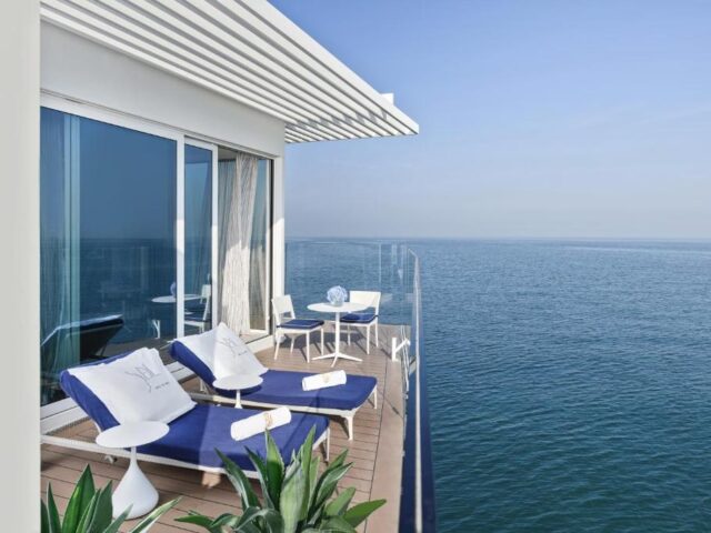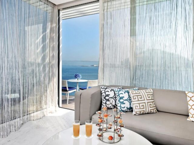 Featuring floor to ceiling windows with panoramic view of the Arabian Gulf, each suite includes an iPad, complimentary WiFi, a 21-inch iMac, and widescreen interactive HD TV. Bose iPhone docking station and media hub is also available.