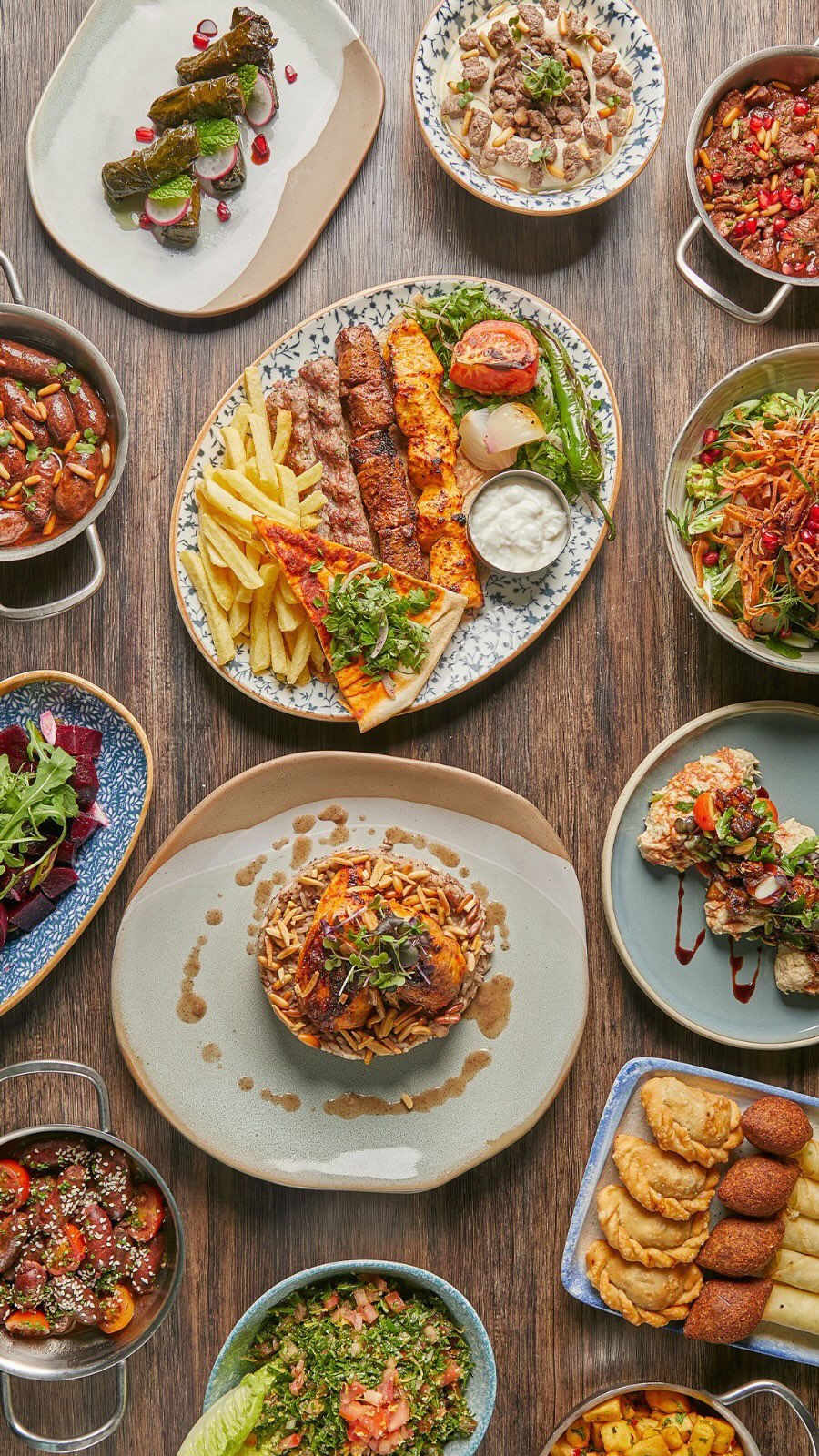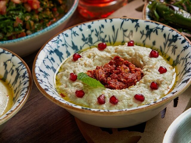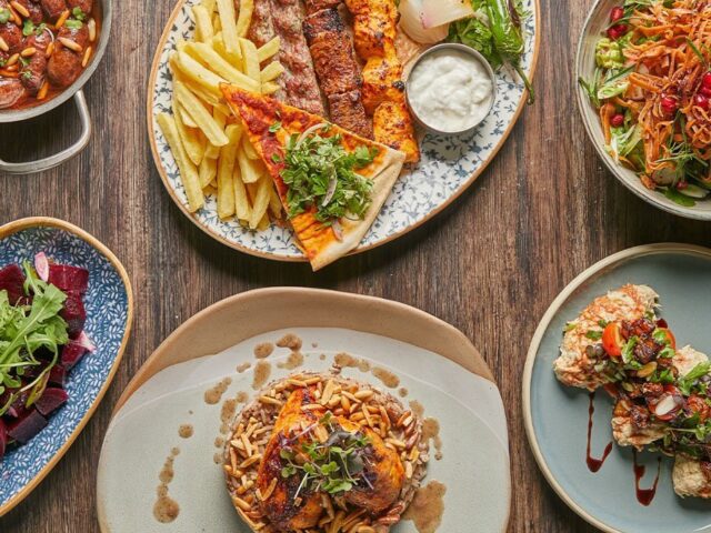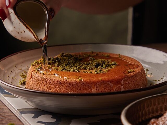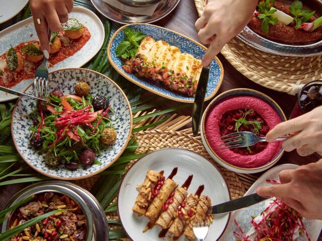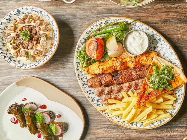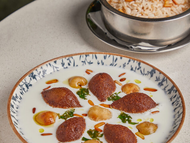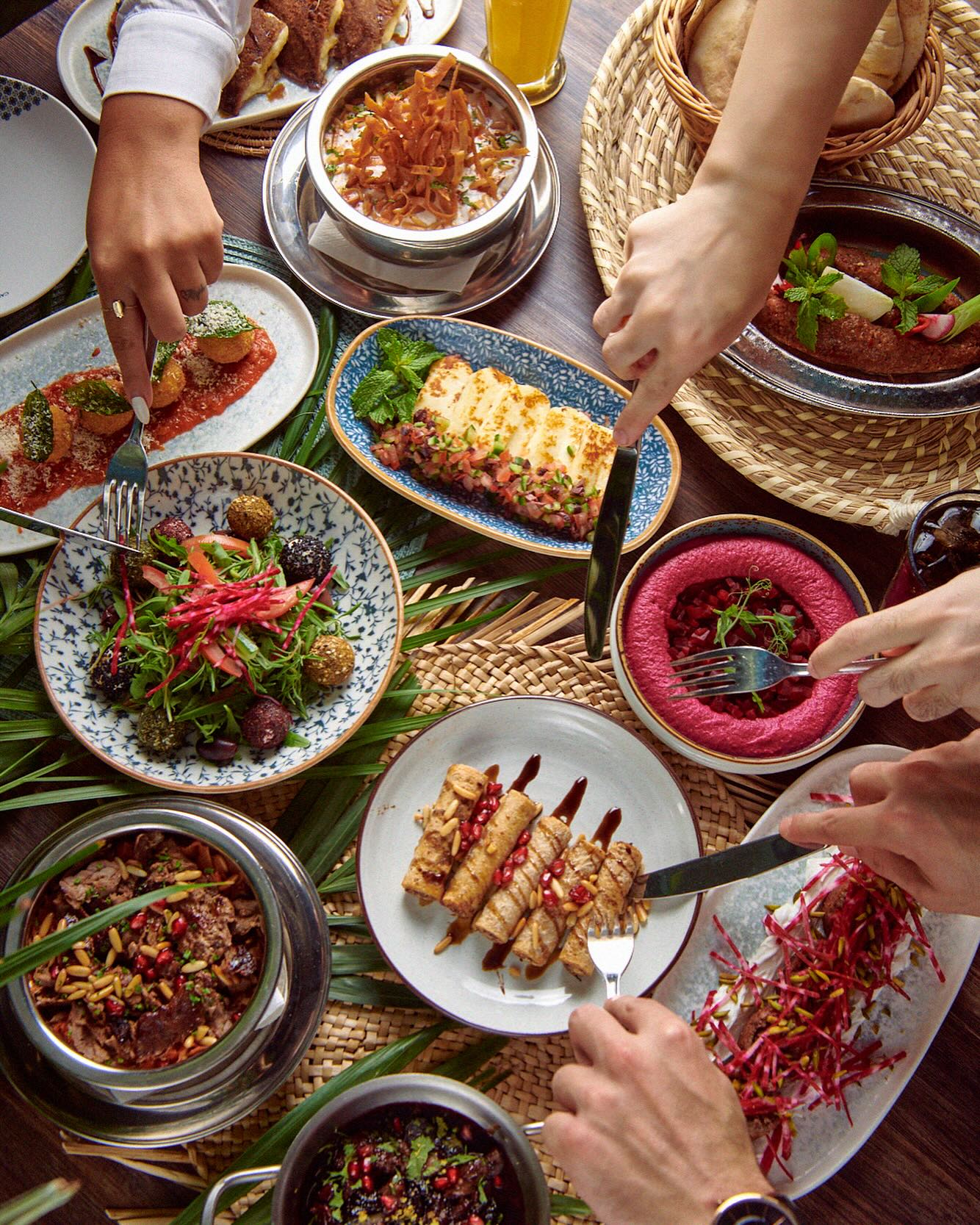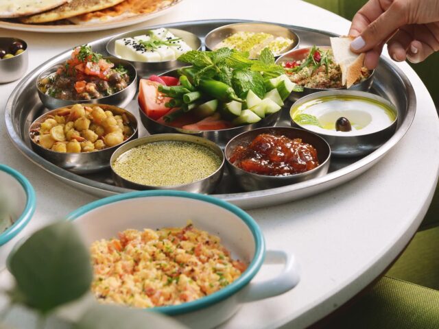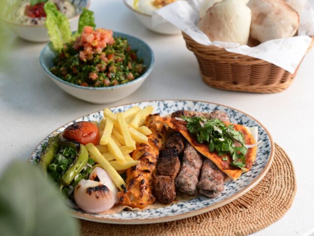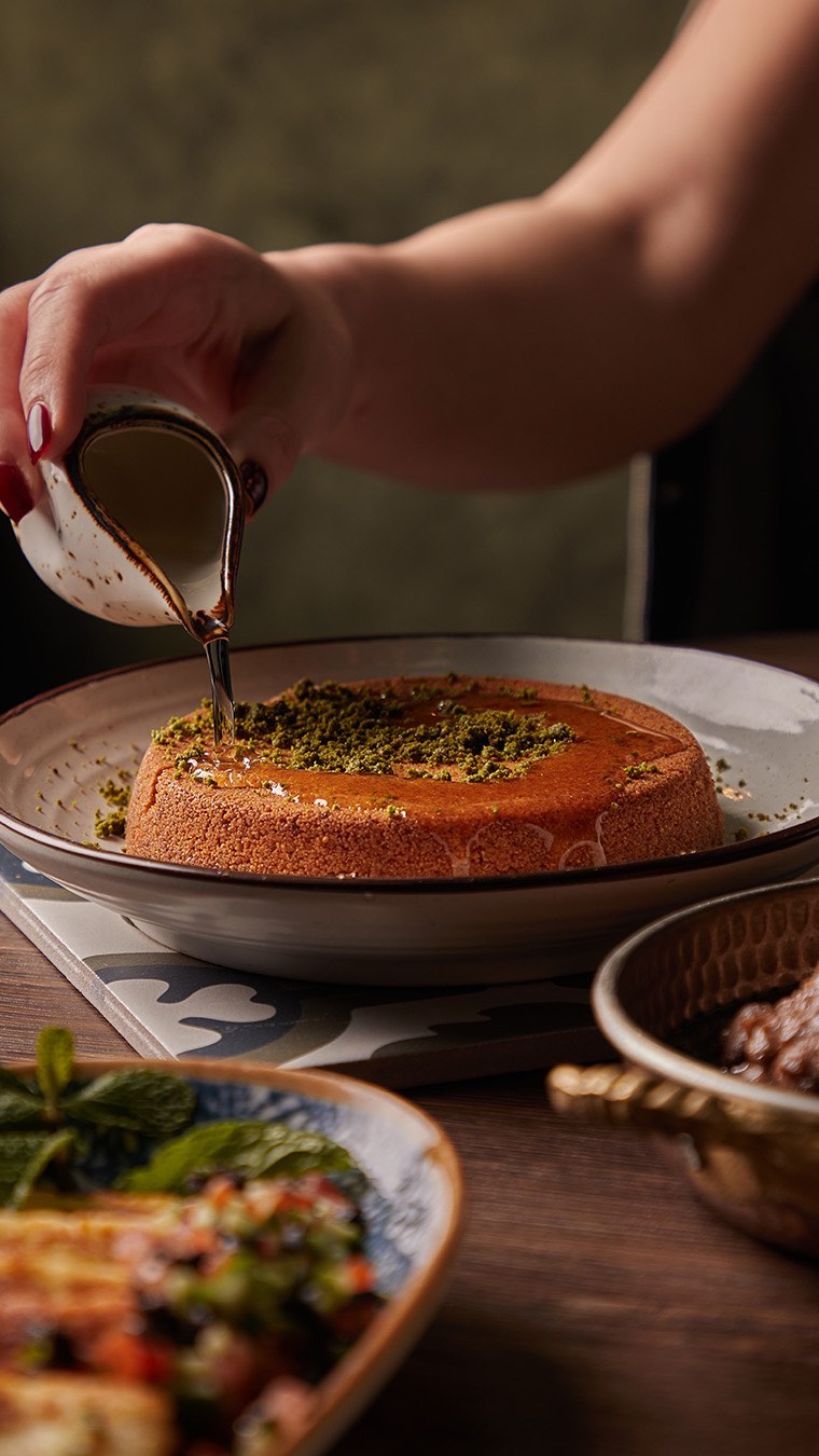 An extensive menu caters for every taste from all day breakfasts which include firm favourites such as ballila with pine nuts, eggs and soujouk, fattet hummus and grilled halloumi cheese. The lunch menu has a wide choice of cold mezza items including mouttabal, warak enab, shanklish, and labneh with garlic. Hot mezza offers delicacies like sautéed chicken livers, makanek, falafel tacos, ras asfour with pomegranate molasses and tabbouleh. From the grill there are chicken, cutlets, kafta meat, lamb fillet and shawarma. Daily dishes are also available as well as a children’s menu. Those with a sweet tooth will appreciate knefeh, osmalieh cheesecake, um Ali, qatayef with Nutella and daaoukyeh.