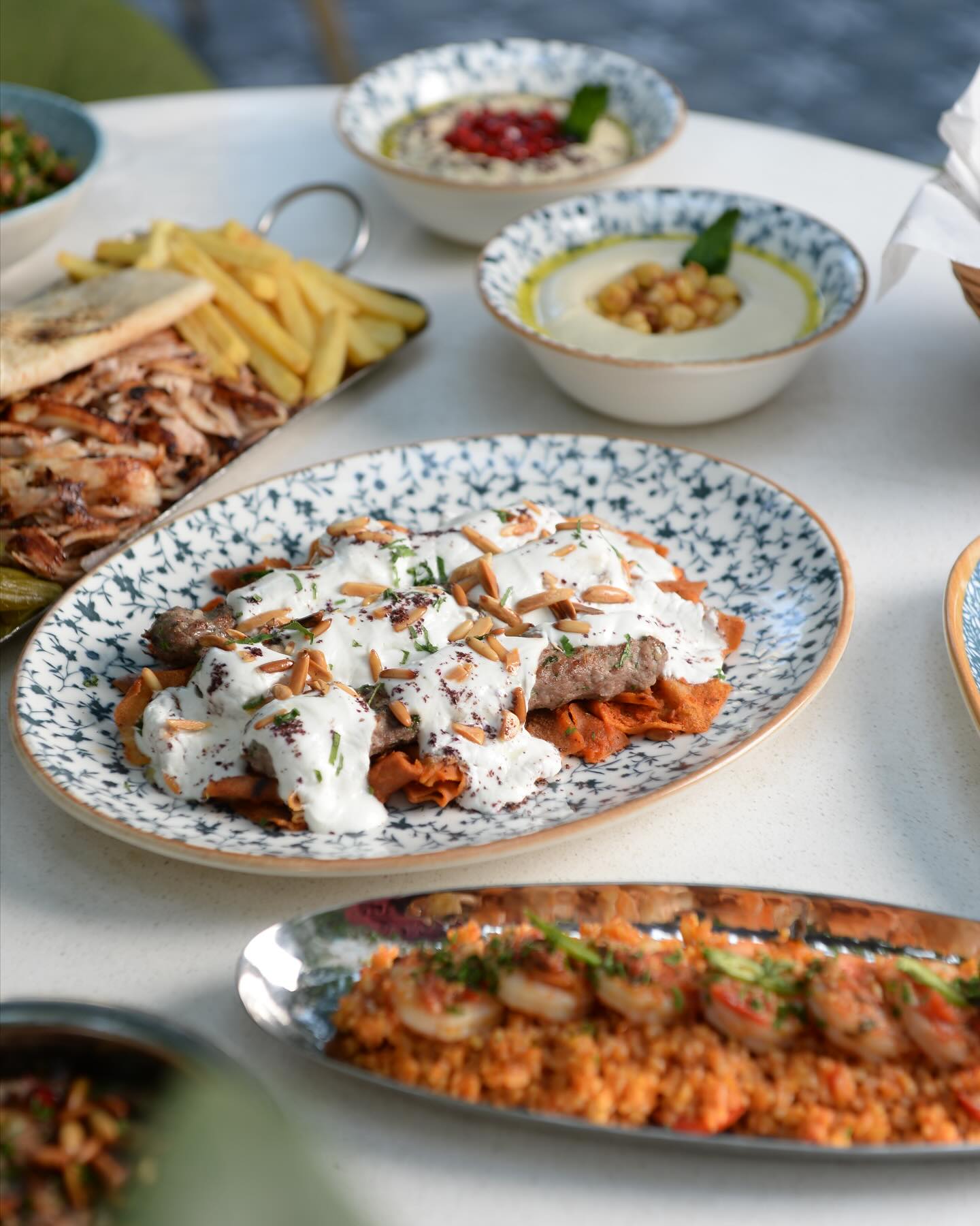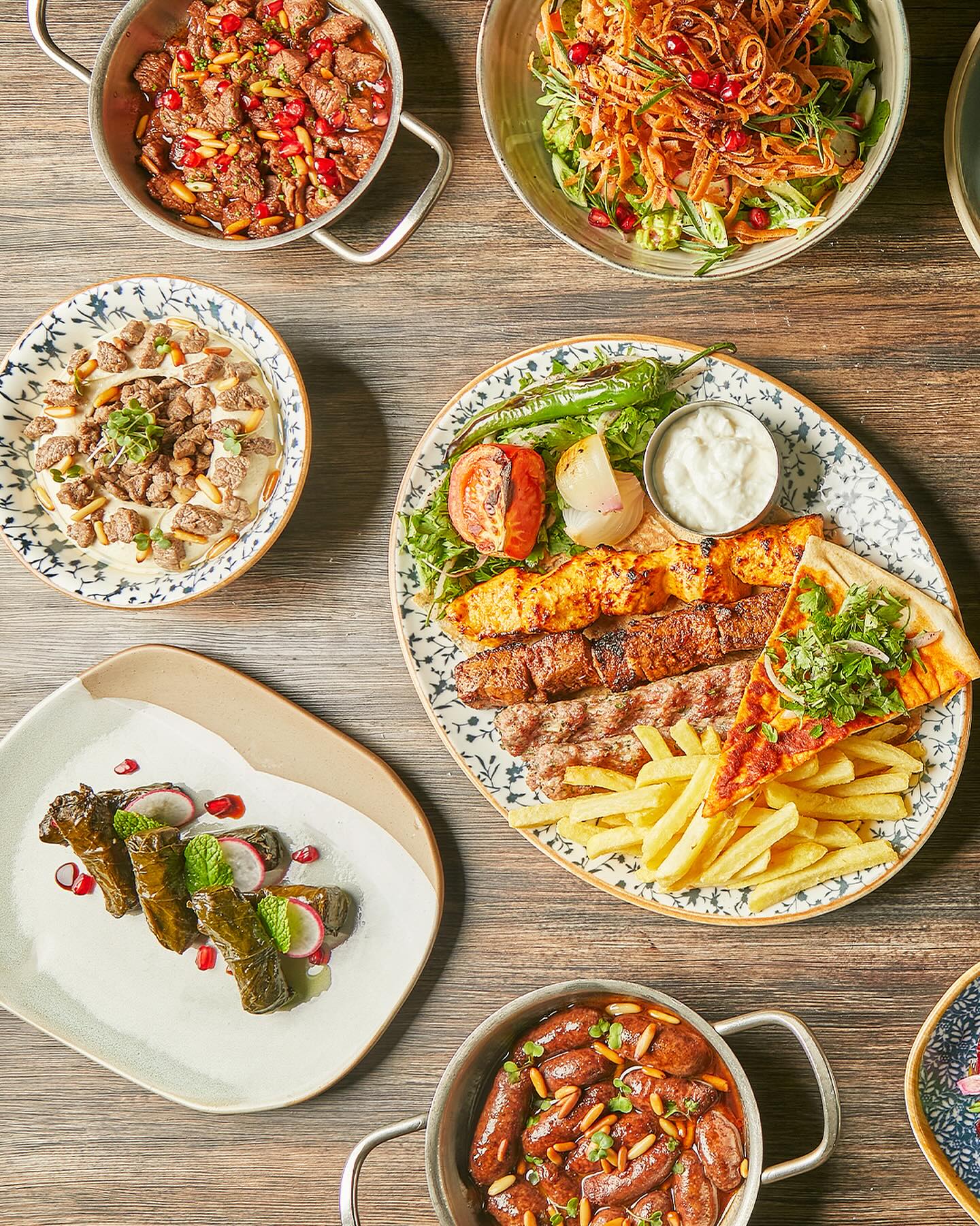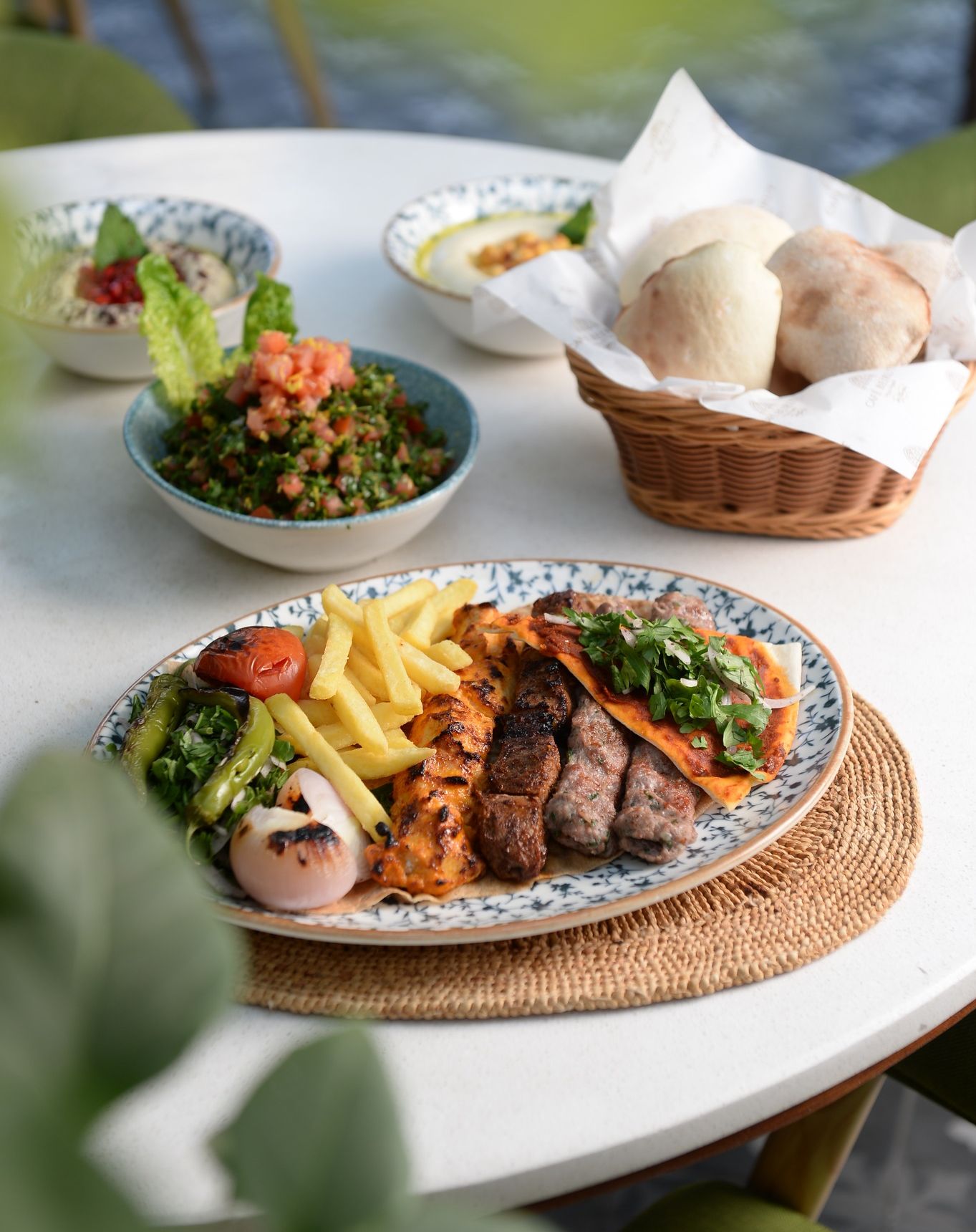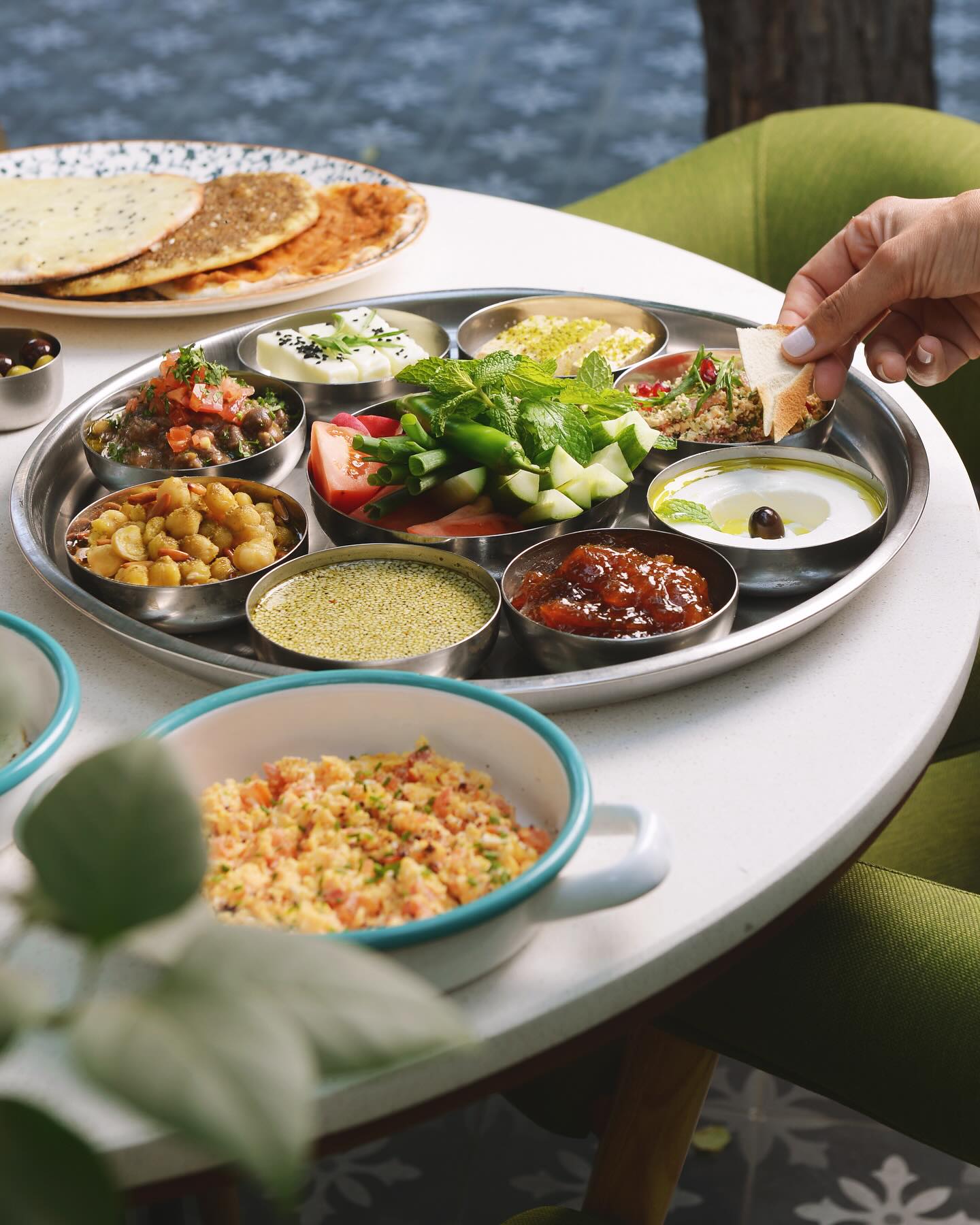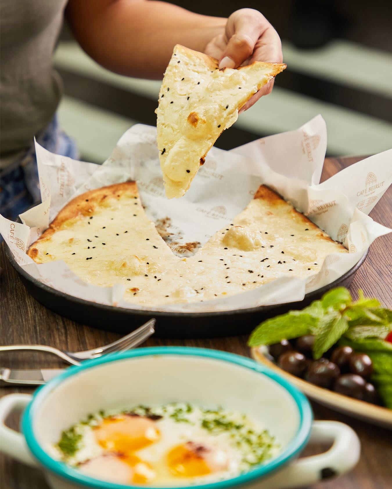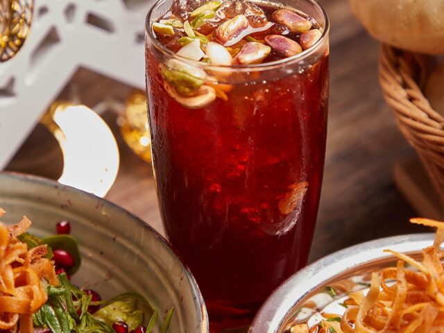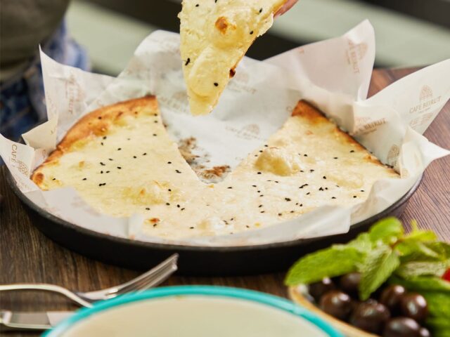 An extensive menu caters for every taste from all day breakfasts which include firm favourites such as ballila with pine nuts, eggs and soujouk, fattet hummus and grilled halloumi cheese. The lunch menu has a wide choice of cold mezza items including mouttabal, warak enab, shanklish, and labneh with garlic. Hot mezza offers delicacies like sautéed chicken livers, makanek, falafel tacos, ras asfour with pomegranate molasses and tabbouleh. From the grill there are chicken, cutlets, kafta meat, lamb fillet and shawarma. Daily dishes are also available as well as a children’s menu. Those with a sweet tooth will appreciate knefeh, osmalieh cheesecake, um Ali, qatayef with Nutella and daaoukyeh.