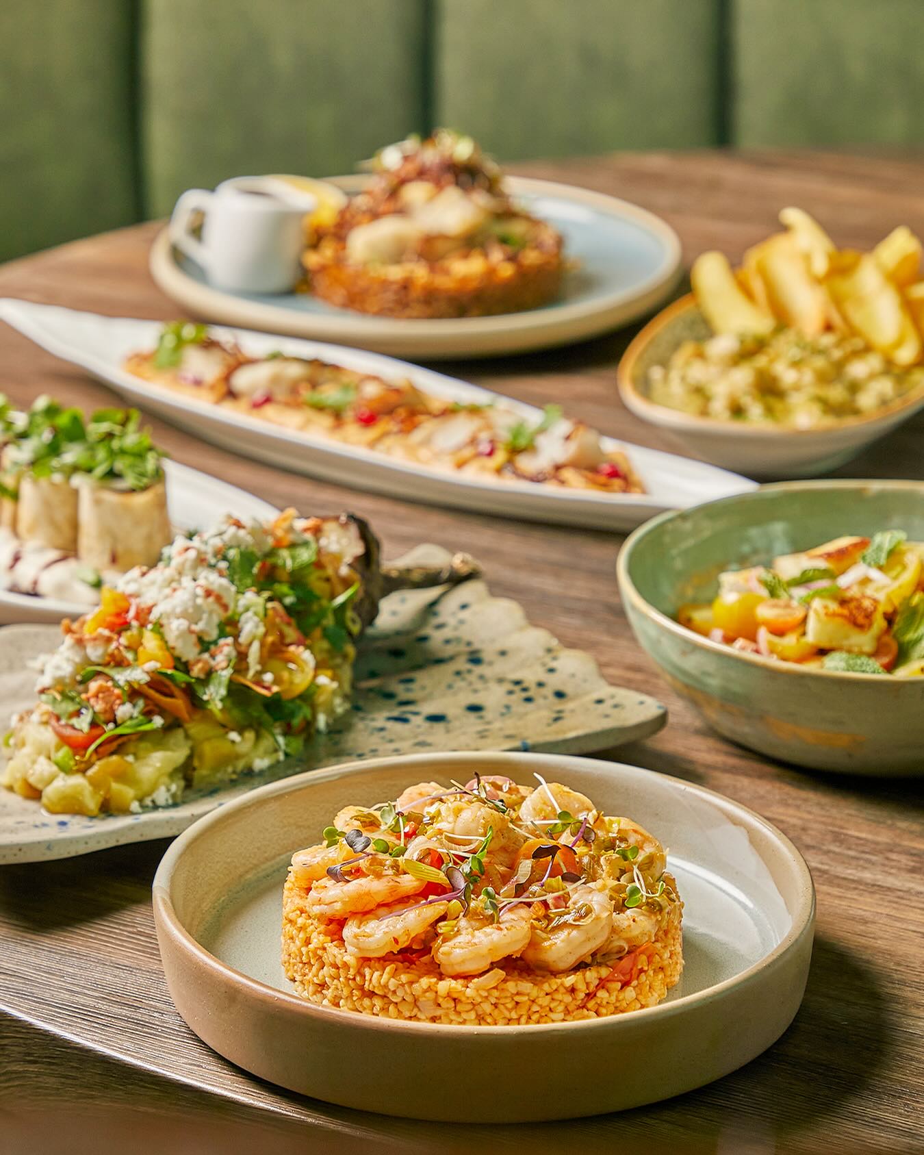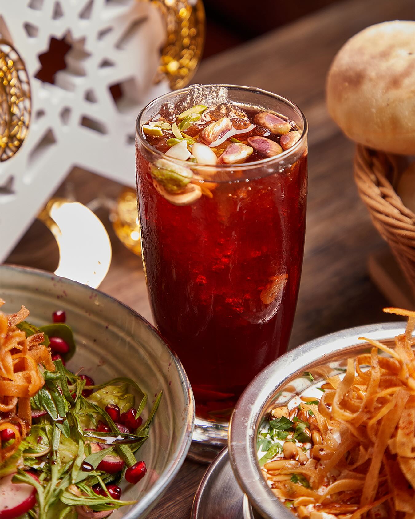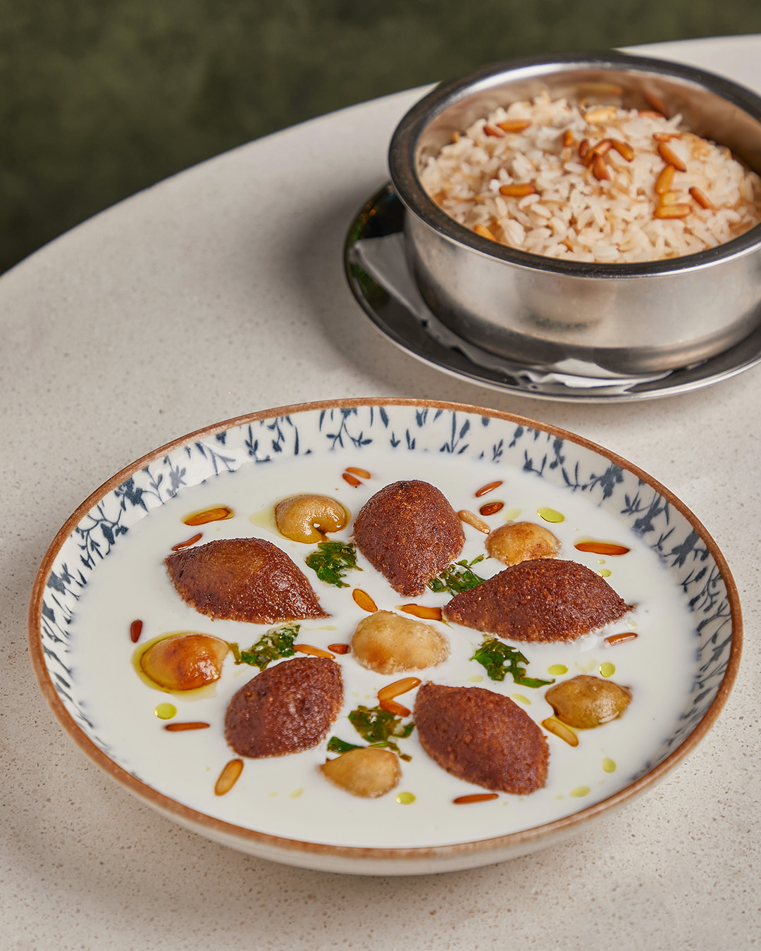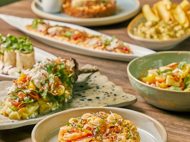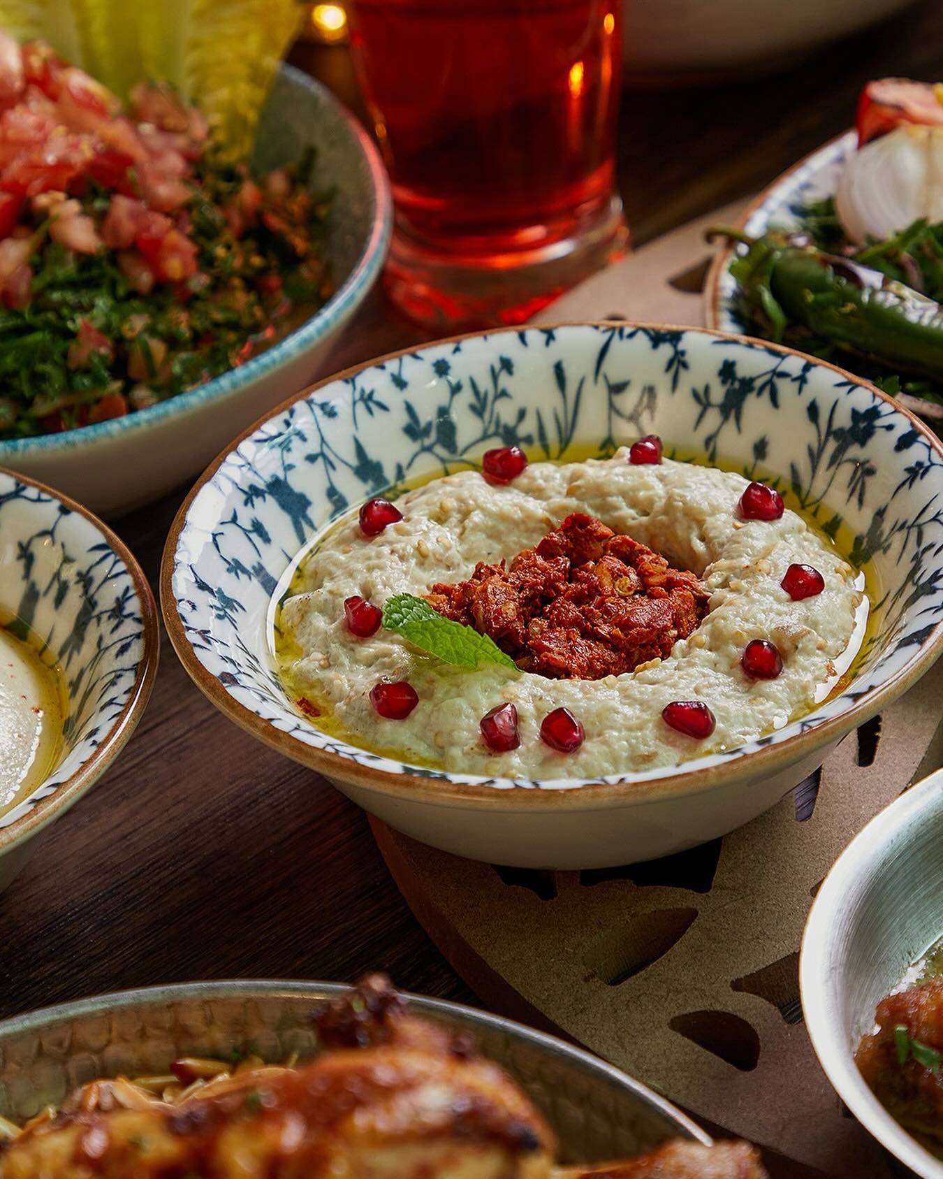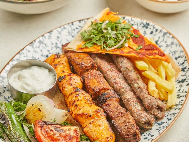 An extensive menu caters for every taste from all day breakfasts which include firm favourites such as ballila with pine nuts, eggs and soujouk, fattet hummus and grilled halloumi cheese. The lunch menu has a wide choice of cold mezza items including mouttabal, warak enab, shanklish, and labneh with garlic. Hot mezza offers delicacies like sautéed chicken livers, makanek, falafel tacos, ras asfour with pomegranate molasses and tabbouleh. From the grill there are chicken, cutlets, kafta meat, lamb fillet and shawarma. Daily dishes are also available as well as a children’s menu. Those with a sweet tooth will appreciate knefeh, osmalieh cheesecake, um Ali, qatayef with Nutella and daaoukyeh.