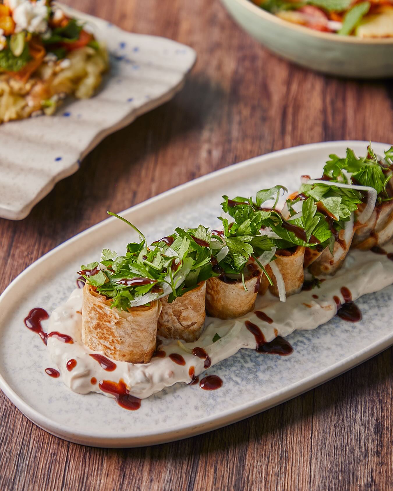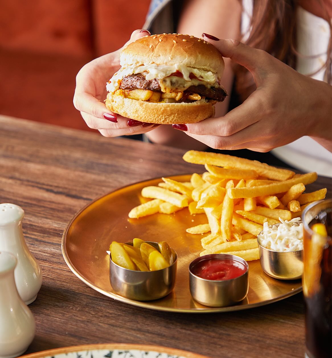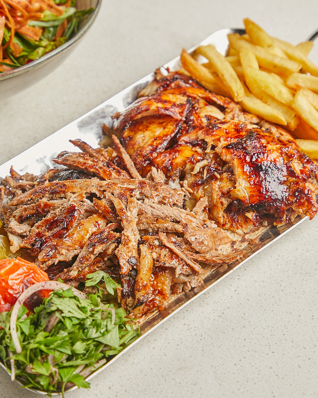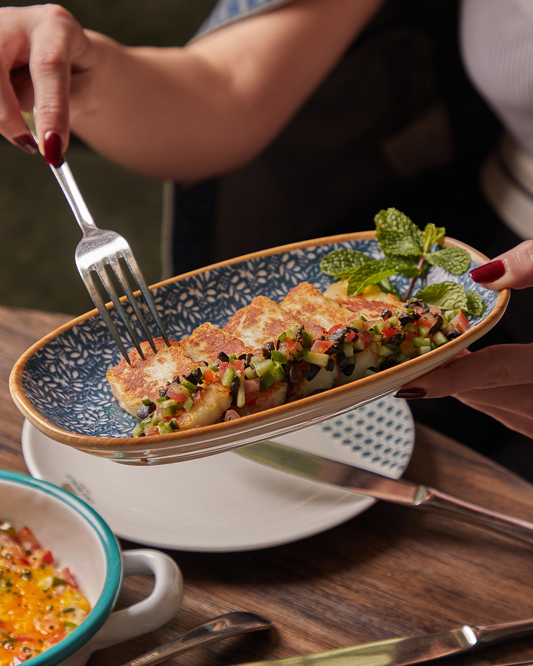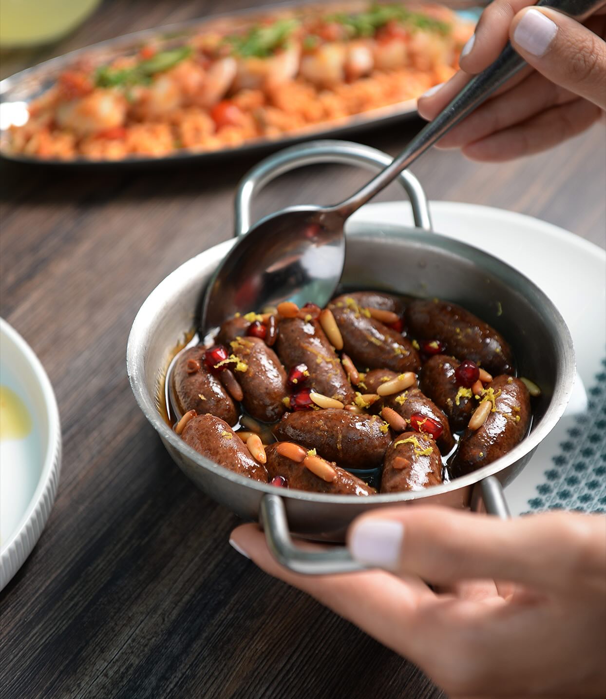 An extensive menu caters for every taste from all day breakfasts which include firm favourites such as ballila with pine nuts, eggs and soujouk, fattet hummus and grilled halloumi cheese. The lunch menu has a wide choice of cold mezza items including mouttabal, warak enab, shanklish, and labneh with garlic. Hot mezza offers delicacies like sautéed chicken livers, makanek, falafel tacos, ras asfour with pomegranate molasses and tabbouleh. From the grill there are chicken, cutlets, kafta meat, lamb fillet and shawarma. Daily dishes are also available as well as a children’s menu. Those with a sweet tooth will appreciate knefeh, osmalieh cheesecake, um Ali, qatayef with Nutella and daaoukyeh.