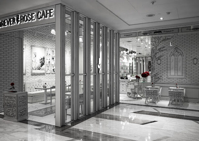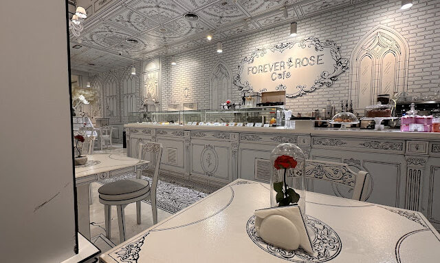 Forever Rose Café – Abu Dhabi is a fairytale-inspired café known for its romantic 2D black-and-white interior design, giving the illusion of stepping into a hand-drawn storybook. Originally from London, it offers an elegant setting with floral accents and a whimsical vibe.