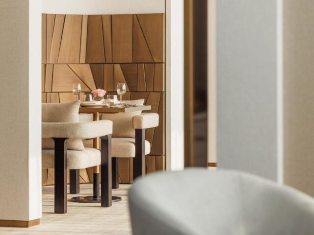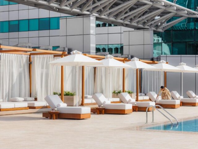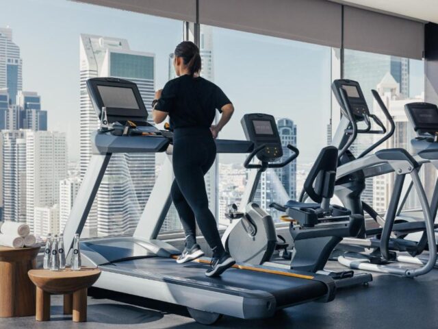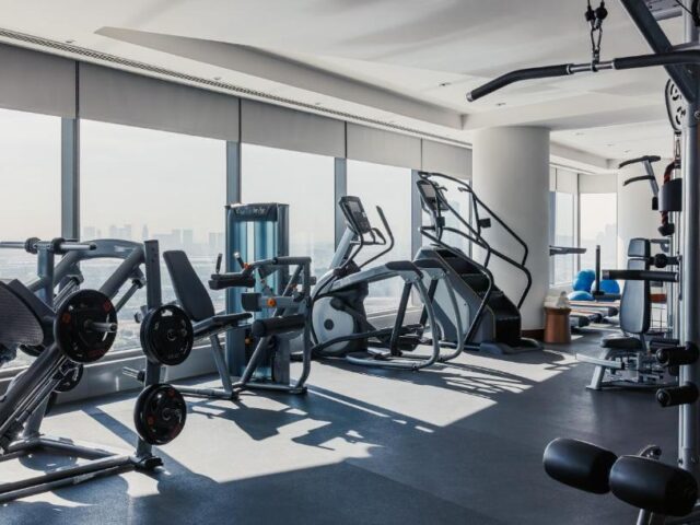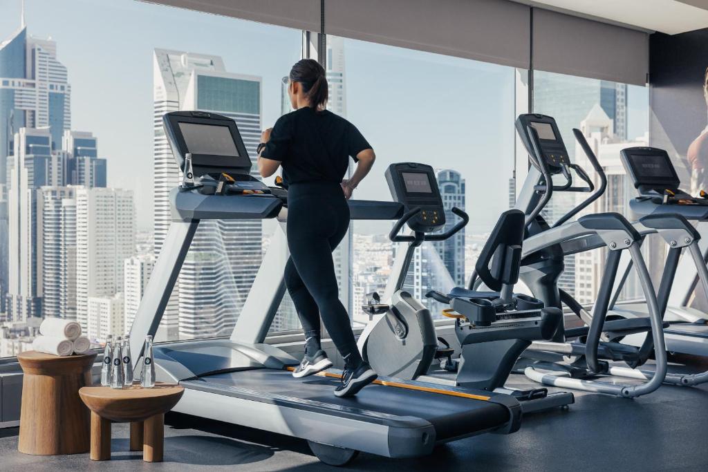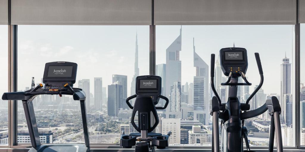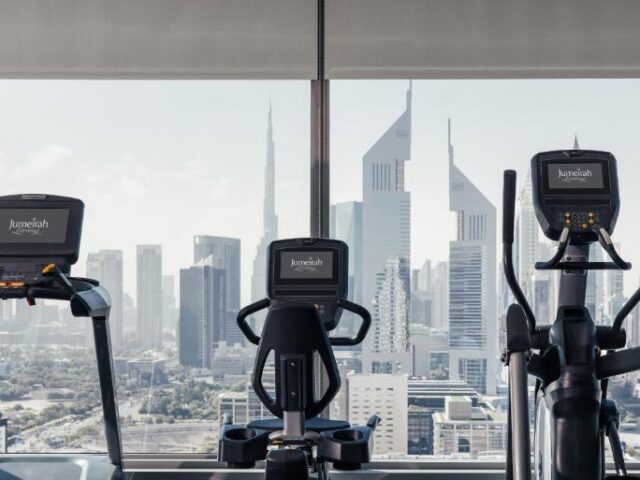 Recreational facilities at Jumeirah Living include a rooftop swimming pool, a children’s pool and a large gym with modern equipment.