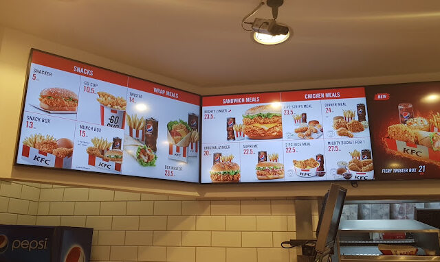 KFC’s original product is pressure-fried chicken pieces, seasoned with Sanders’ recipe of 11 herbs and spices. The constituents of the recipe are a trade secret. Larger portions of fried chicken are served in a cardboard “bucket”, which has become a feature of the chain since it was first introduced by franchisee Pete Harman in 1957. Since the early-1990s, KFC has expanded its menu to offer other chicken products such as chicken fillet sandwiches and wraps, as well as salads and side dishes such as French fries and coleslaw, desserts, and soft drinks; the latter often supplied by PepsiCo. KFC is known for its slogans “It’s Finger Lickin’ Good!”, “Nobody does chicken like KFC”, and “So good”.