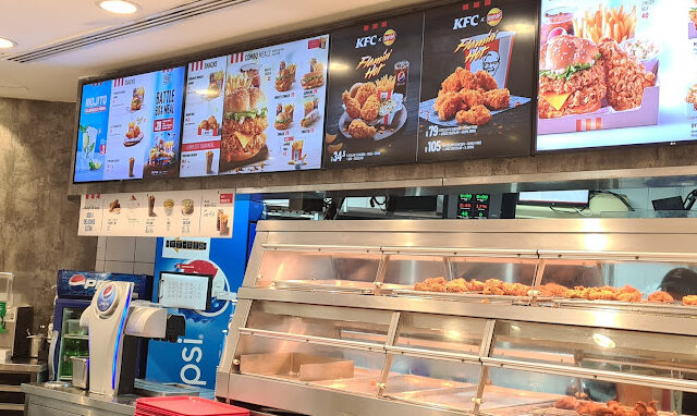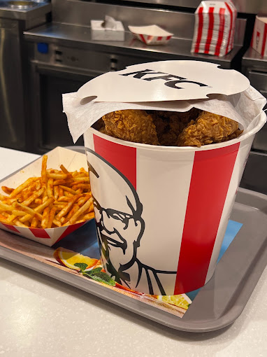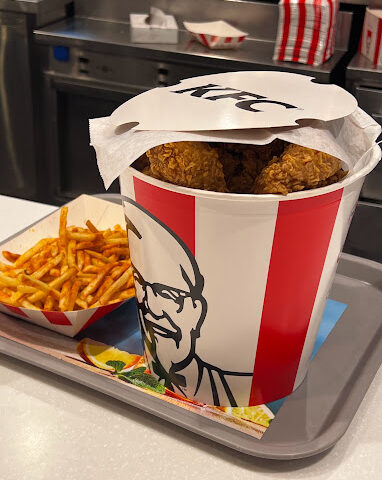 KFC’s original product is pressure-fried chicken pieces, seasoned with Sanders’ recipe of 11 herbs and spices. The constituents of the recipe are a trade secret. Larger portions of fried chicken are served in a cardboard “bucket”, which has become a feature of the chain since it was first introduced by franchisee Pete Harman in 1957. Since the early-1990s, KFC has expanded its menu to offer other chicken products such as chicken fillet sandwiches and wraps, as well as salads and side dishes such as French fries and coleslaw, desserts, and soft drinks; the latter often supplied by PepsiCo. KFC is known for its slogans “It’s Finger Lickin’ Good!”, “Nobody does chicken like KFC”, and “So good”.