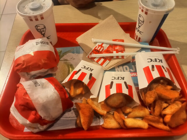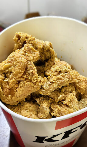 KFC’s original product is pressure-fried chicken pieces, seasoned with Sanders’ recipe of 11 herbs and spices. The constituents of the recipe are a trade secret. Larger portions of fried chicken are served in a cardboard “bucket”, which has become a feature of the chain since it was first introduced by franchisee Pete Harman in 1957. Since the early-1990s, KFC has expanded its menu to offer other chicken products such as chicken fillet sandwiches and wraps, as well as salads and side dishes such as French fries and coleslaw, desserts, and soft drinks; the latter often supplied by PepsiCo. KFC is known for its slogans “It’s Finger Lickin’ Good!”, “Nobody does chicken like KFC”, and “So good”.