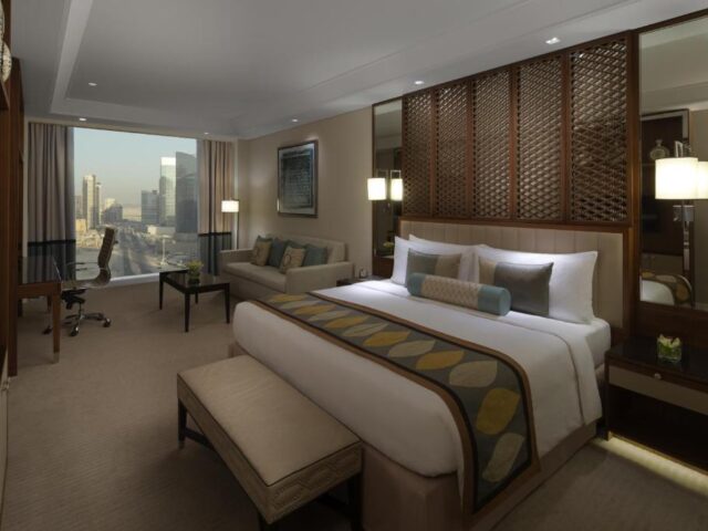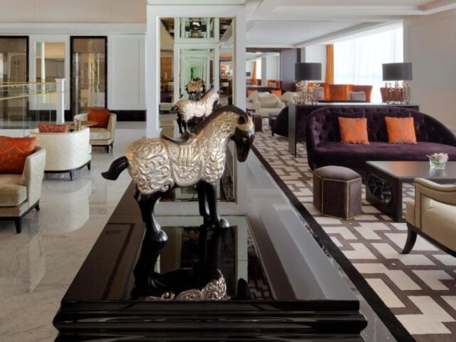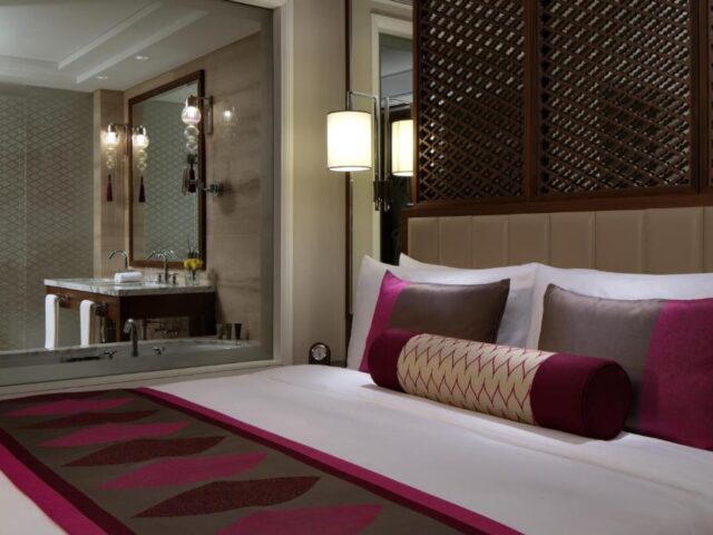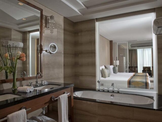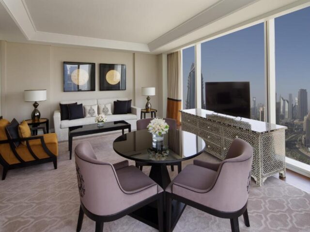 Featuring panoramic views of Burj Khalifa, the luxurious Indian themed Taj Dubai is located in the heart of the business bay area just a stone’s throw away from the Dubai’s famed Downtown area and Dubai Mall, that can easily be reached with the free shuttle bus that the hotel operates. It includes an outdoor pool, a spa and wellness center. Guests can enjoy free WiFi access in all areas of the hotel.