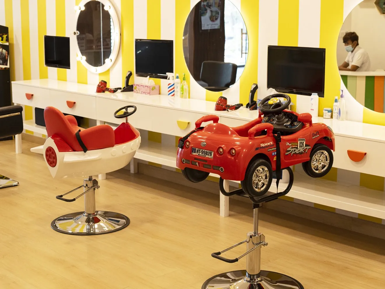 - Colourful fantasy‑car and speed‑boat themed salon chairs for kids