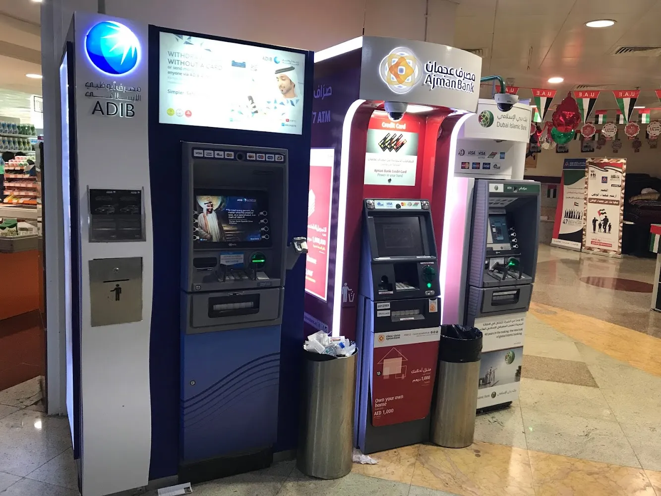 Several leading banks operate extensive ATM networks across the emirate. These include Emirates NBD, Abu Dhabi Commercial Bank, First Abu Dhabi Bank, Mashreq Bank, Dubai Islamic Bank, Ajman Bank, and Sharjah Islamic Bank.
