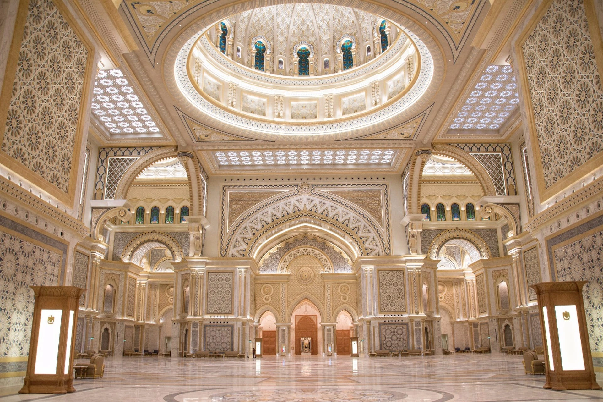 One of the most striking features of Qasr Al Watan Palace in Abu Dhabi is its central dome, which is among the largest in the region. The interiors are adorned with geometric patterns, calligraphy, and luxurious materials that symbolize the richness of Emirati culture.